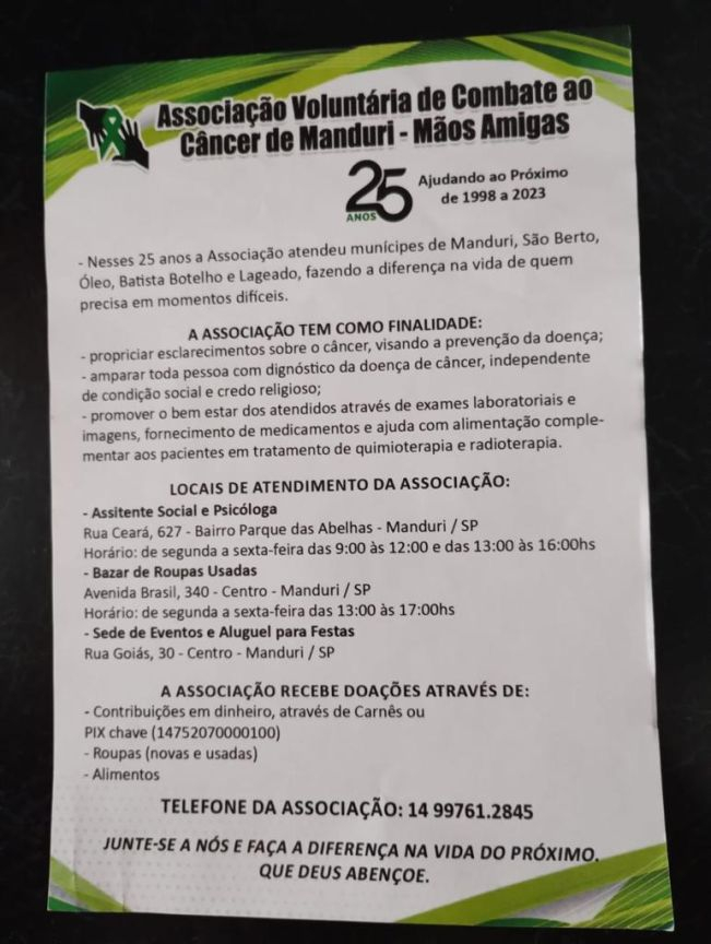 No dia 09/03/23 a Associação comemorou seus 25 anos, de amor, trabalho, solidariedade e empatia!E para continuar as comemorações no dia 11/03/23 foi realizado um evento em frente ao bazar. Foram entregues chaveiros e panfletos da Associação